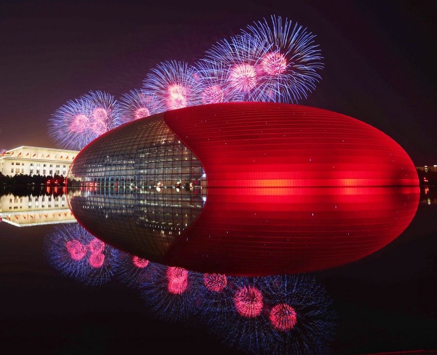 Fireworks explode during a grand evening gala marking the 70th founding anniversary of the People's Republic of China (PRC) in Beijing, capital of China, Oct. 1, 2019. (Xinhua/Zhang Hongxiang)
