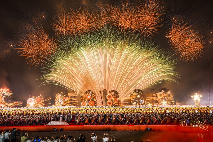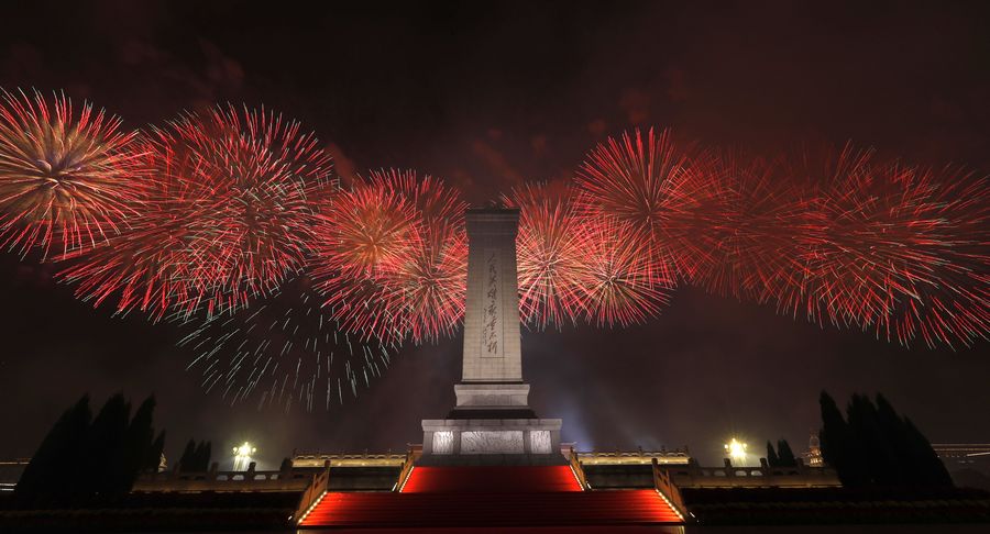 Fireworks explode during a grand evening gala marking the 70th founding anniversary of the People's Republic of China (PRC) in Beijing, capital of China, Oct. 1, 2019. (Xinhua/Wang Yuguo)
