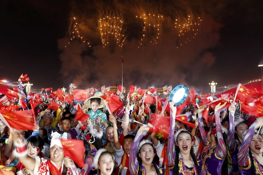 People celebrate during a grand evening gala marking the 70th founding anniversary of the People's Republic of China (PRC) held at Tian'anmen Square in Beijing, capital of China, Oct. 1, 2019. (Xinhua/Chen Yehua)