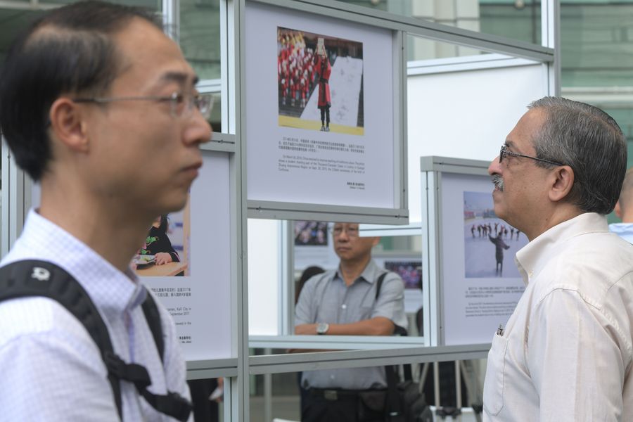 People view photo exhibits of "Raising Hopes - an educational photo exhibition for the 70th anniversary of the founding of the People's Republic of China" held in Singapore's Capitol Piazza on Oct 4, 2019. (Xinhua/Then Chih Wey)