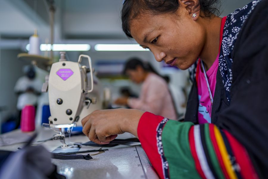 People make ethnic clothes at a workshop of a relocation site in Lisu Autonomous Prefecture of Nujiang, southwest China's Yunnan Province, Sept. 16, 2019. (Xinhua/Jiang Wenyao)