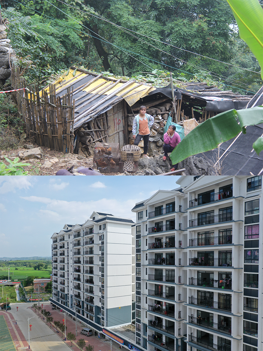 Combo photo shows villagers and their houses at Longbang Village, Nov. 11, 2018 (top, file photo) and a view of the resettlement site for poverty relief relocation for Longbang Village at Silin Township in Tiandong County, south China's Guangxi Zhuang Autonomous Region, Aug. 28, 2019 (bottom, aerial photo taken by Cao Yiming). (Xinhua)
