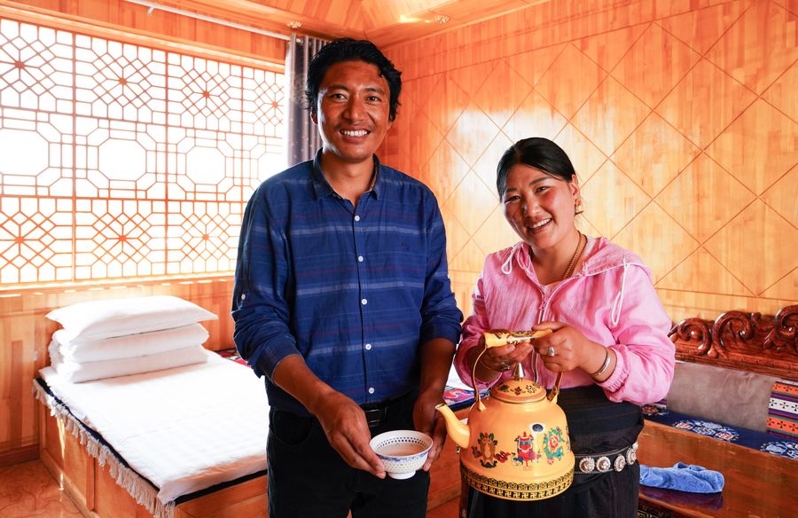 Photo taken on Aug. 27, 2019 shows a couple at their farm stay in Gaxiu Village, Gannan Tibetan Autonomous Prefecture of northwest China's Gansu Province. (Xinhua/Chen Junqing)