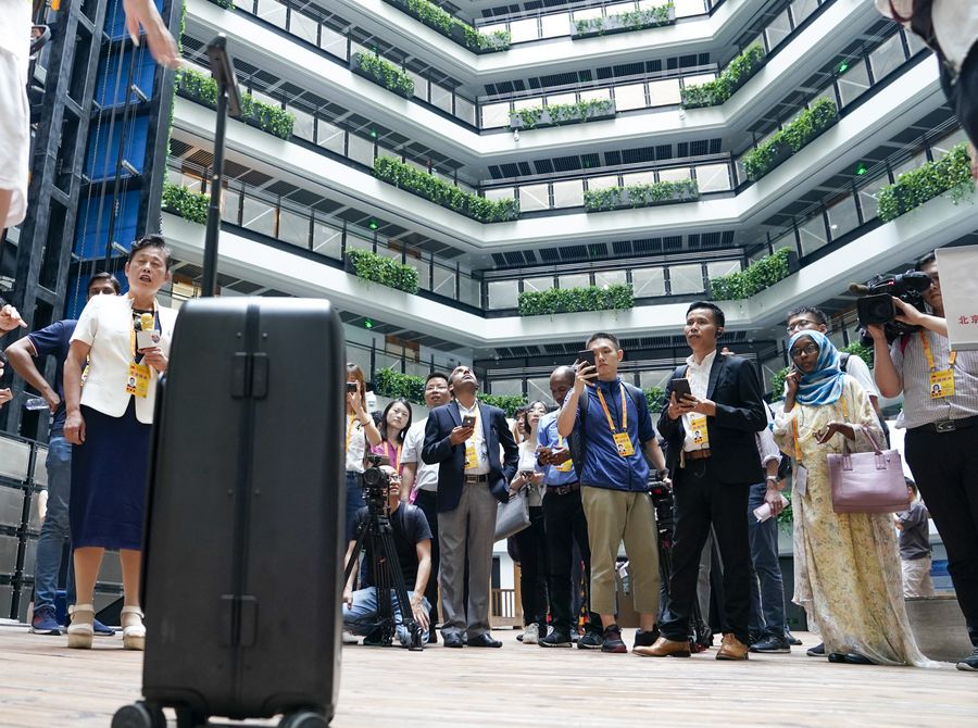 Journalists view an intelligent suitcase during a visit to the Innovation Achievement Exhibition in Zhongguancun National Innovative Demonstration Zone in Beijing, capital of China, Sept. 26, 2019. (Xinhua/Liu Chan)