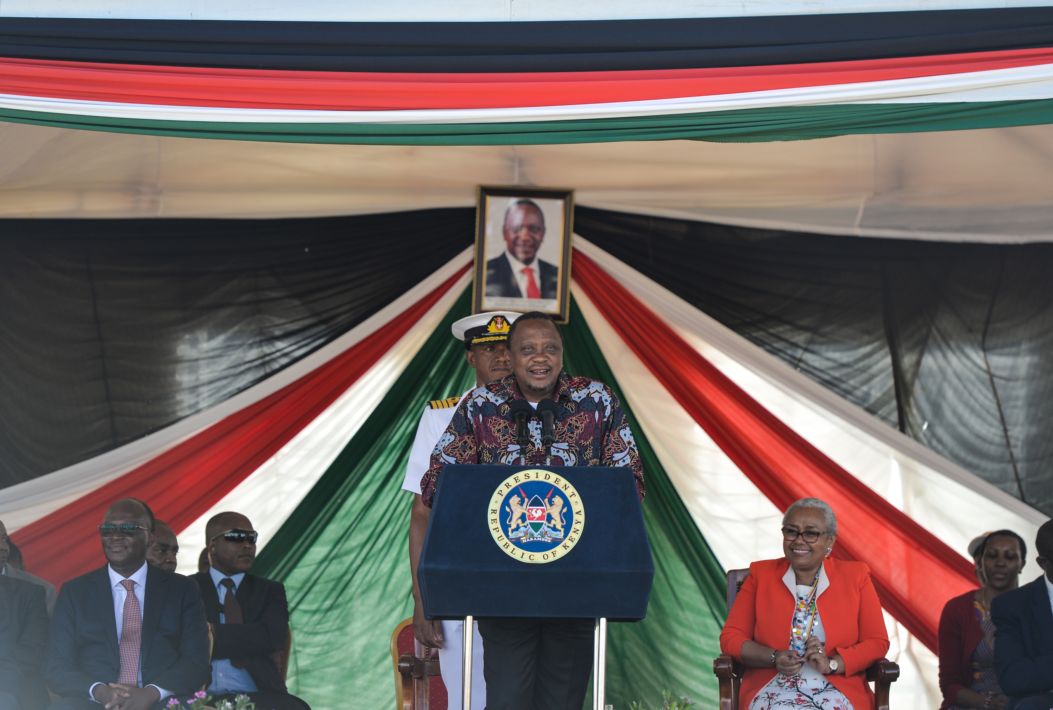 Kenyan President Uhuru Kenyatta delivers a speech at the launching ceremony of Kenya's standard gauge railway (SGR) Phase 2A at Maai Mahiu Station in Kenya, Oct. 16, 2019. (Xinhua/Li Yan)