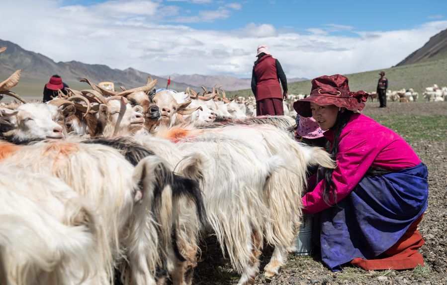 A herdswoman from a cooperative milks sheep in Rutog County of Ngari Prefecture, southwest China's Tibet Autonomous Region, Aug. 4, 2019. (Xinhua/Jigme Dorje)