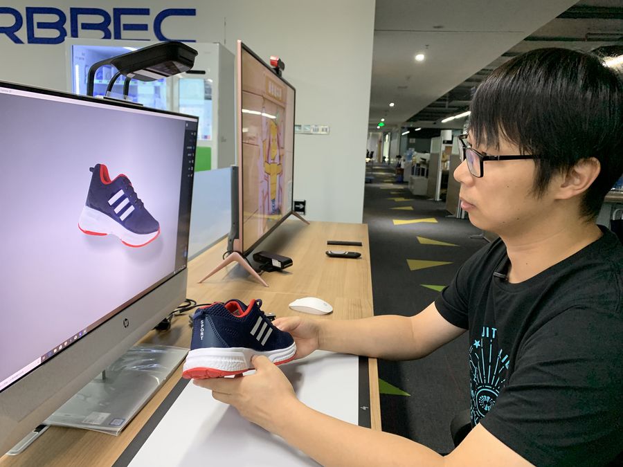 Photo taken on Sept. 20, 2019 shows an R&D staff of Orbbec, a Shenzhen-based unicorn startup specialized in 3D sensing technology, displaying their 3D camera product at Orbbec's headquarters in Yuehai subdistrict. (Xinhua/Li Sijia)
