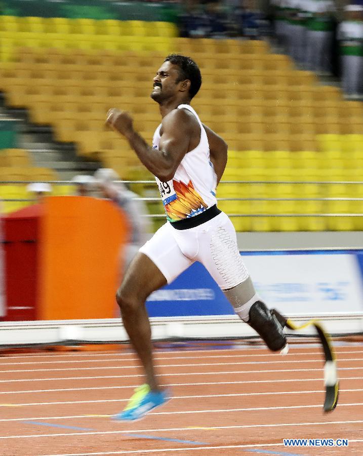 Gunasekaran Anandan of India competes during the disabled men's 400m IT1 final of track and field at the 7th CISM Military World Games in Wuhan, capital of central China's Hubei Province, Oct. 22, 2019. (Xinhua/Wang Lili)