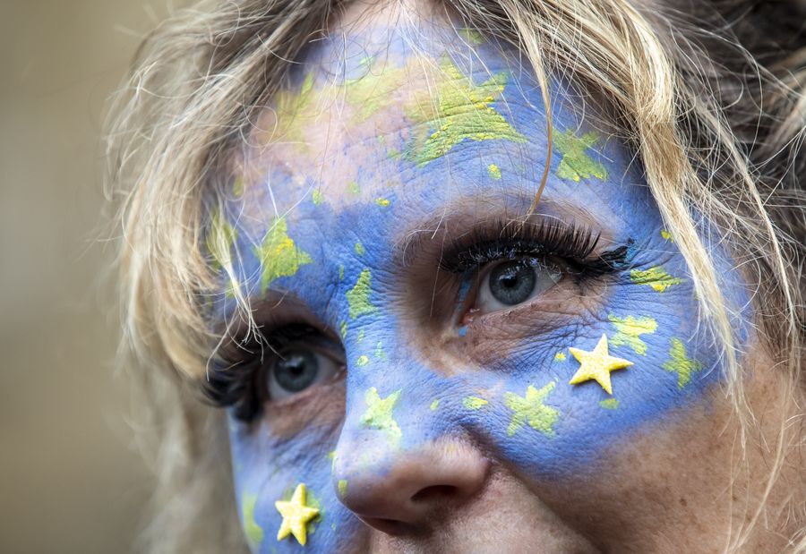 A woman with her face painted in the colors of an EU flag takes part in the "Together for the Final Say" event at the Parliament Square in London, Britain, on Oct. 19, 2019.(Xinhua/Han Yan)