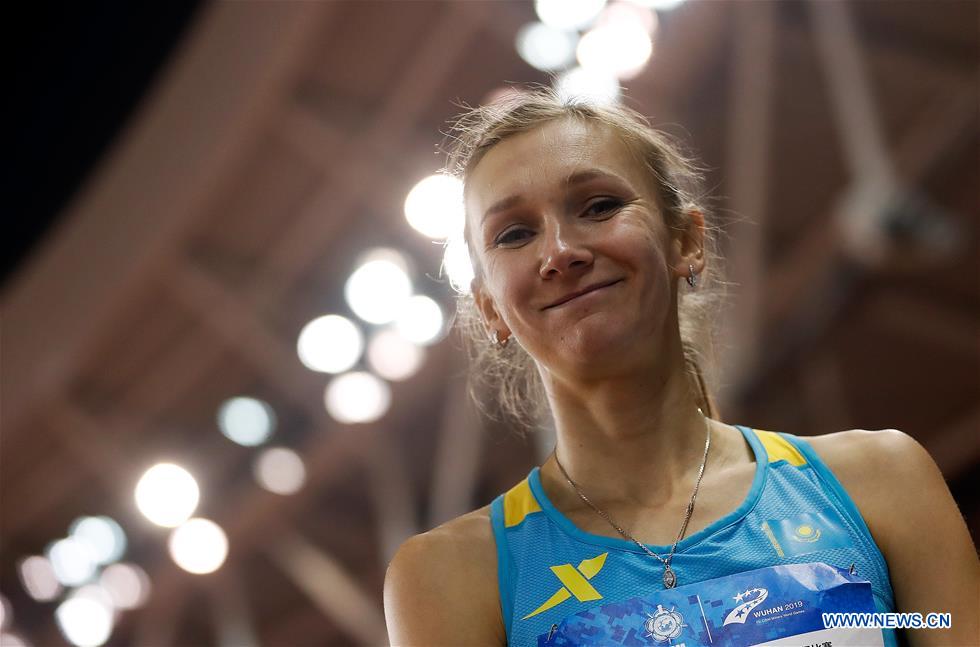 Olga Rypakova of Kazakhstan reacts duirng the women's triple jump final of track and field at the 7th CISM Military World Games in Wuhan, capital of central China's Hubei Province, Oct. 25, 2019. (Xinhua/Wang Lili)