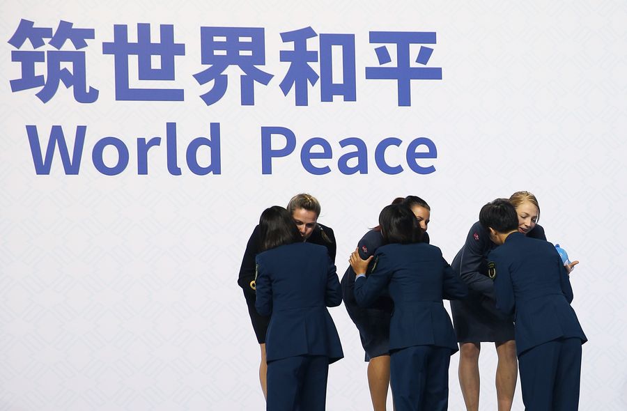 Team China (front) hug with team Norway during the awarding ceremony of the women's team of aeronautical pentathlon at the 7th CISM Military World Games in Wuhan, capital of central China's Hubei Province, Oct. 25, 2019. (Xinhua/Wang Dongzhen)