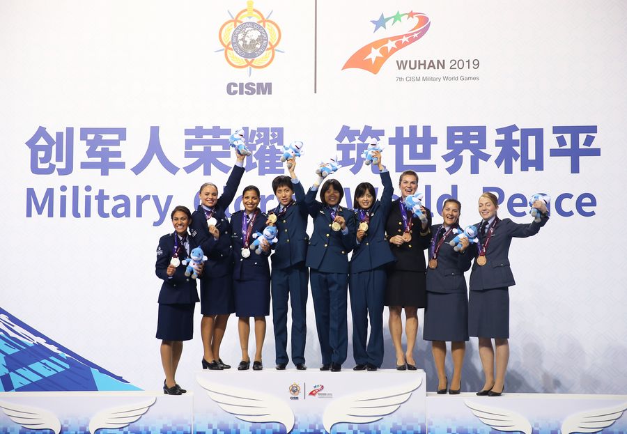 Gold medalists team China (C), silver medalists team Brazil (L) and bronze medalists team Norway attend the awarding ceremony of the women's team of aeronautical pentathlon at the 7th CISM Military World Games in Wuhan, capital of central China's Hubei Province, Oct. 25, 2019. (Xinhua/Wang Dongzhen)