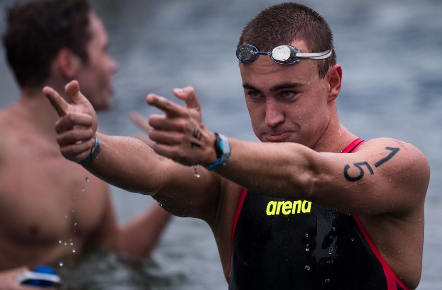 WUHAN, Oct. 25, 2019 (Xinhua) -- Anton Evsikov of Russia reacts after the men's 5km of open water at the 7th CISM Military World Games in Wuhan, capital of central China's Hubei Province, Oct. 25, 2019. (Xinhua/Xiao Yijiu)