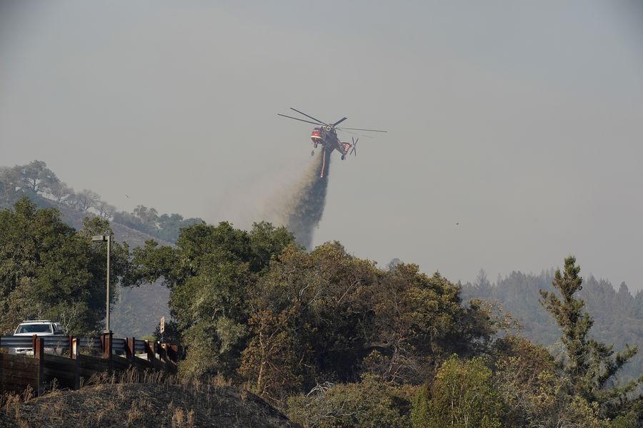 A helicopter tries to extinguish a fire in Sonoma County, northern California, Oct. 24, 2019. (Photo by Li Jianguo/Xinhua)