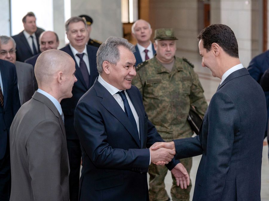 Syrian President Bashar al-Assad (1st R) shakes hands with Russian Defense Minister Sergey Kuzhugetovich Shoygu in Damascus, capital of Syria, March 19, 2019. (Xinhua/Syrian Presidency)
