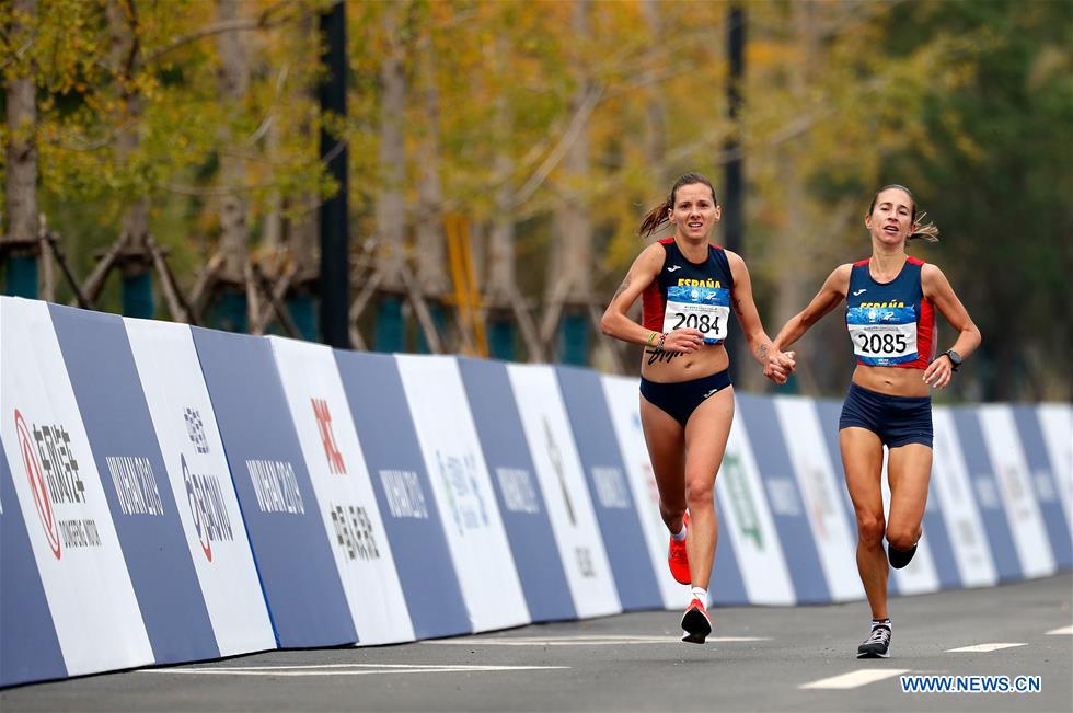 Ana Erika Rodulfo Fernandez (R) of Spain and Patricia Cabedo Serrano of Spain sprint together during the women's marathon individual final of track and field at the 7th CISM Military World Games in Wuhan, capital of central China's Hubei Province, Oct. 27, 2019. (Xinhua/Wang Lili)