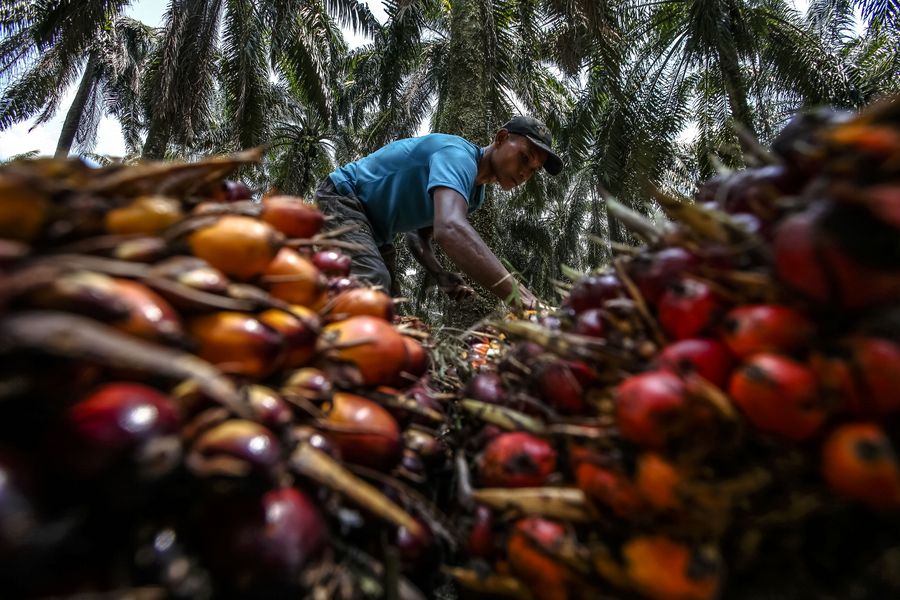 A worker collects palm oil fruit at the palm oil plantation in Langkat of North Sumatra, Indonesia, April 14, 2016. (Xinhua/YT Haryono)