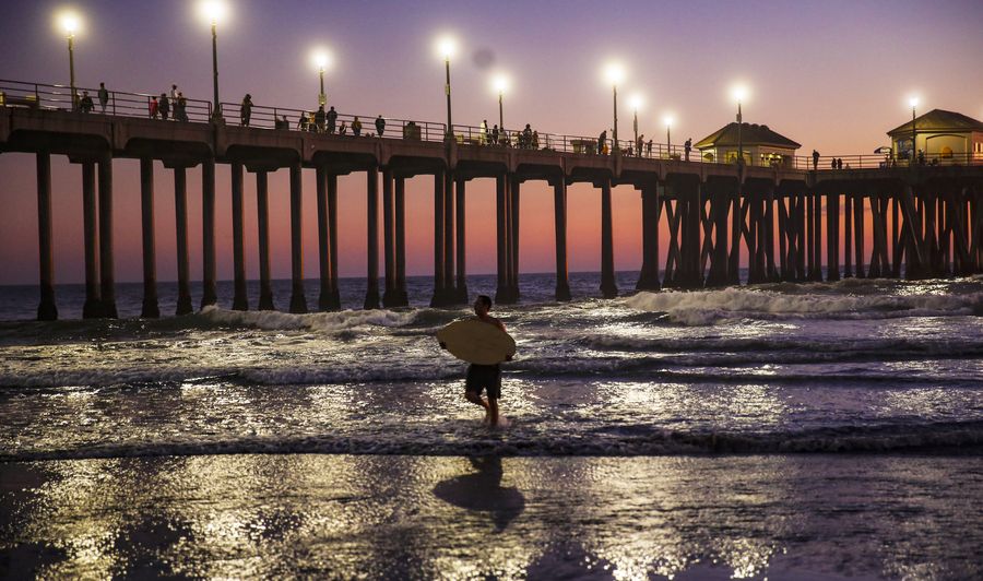 A surfer is seen during sunset on the Huntington Beach, California, the United States, on Nov. 2, 2019. (Xinhua/Li Ying)