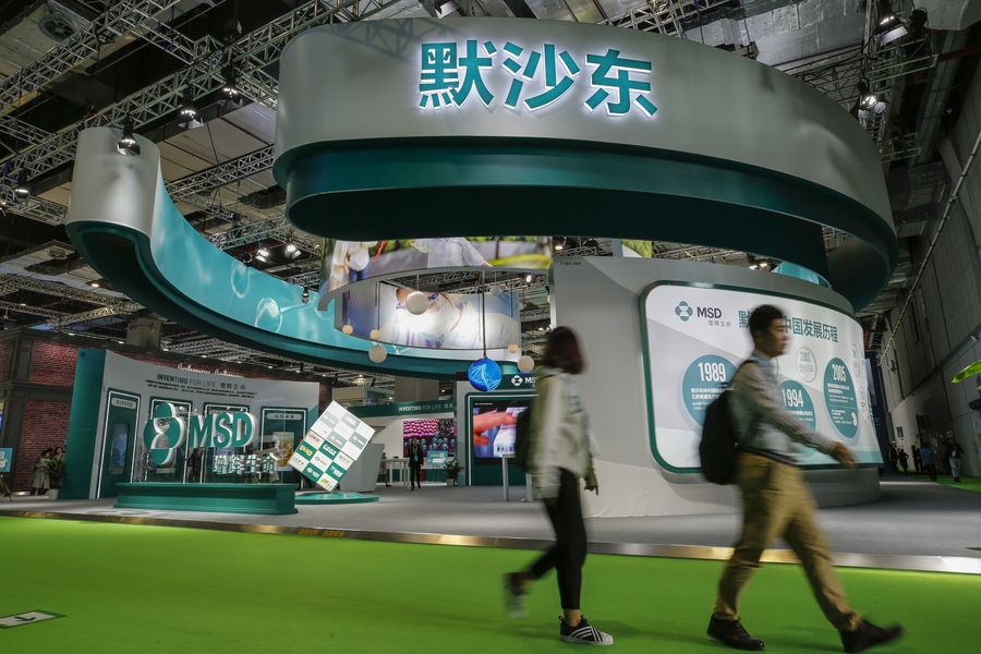 Visitors walk past the booth of MSD during the second China International Import Expo (CIIE) in Shanghai, east China. (Xinhua/Zhang Yuwei)