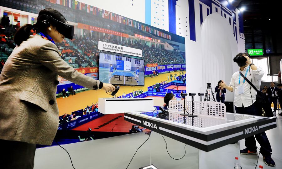 Visitors experience 5G VR table tennis simulators at the Equipment exhibition area during the second China International Import Expo (CIIE) in Shanghai, east China. (Xinhua/Fang Zhe)
