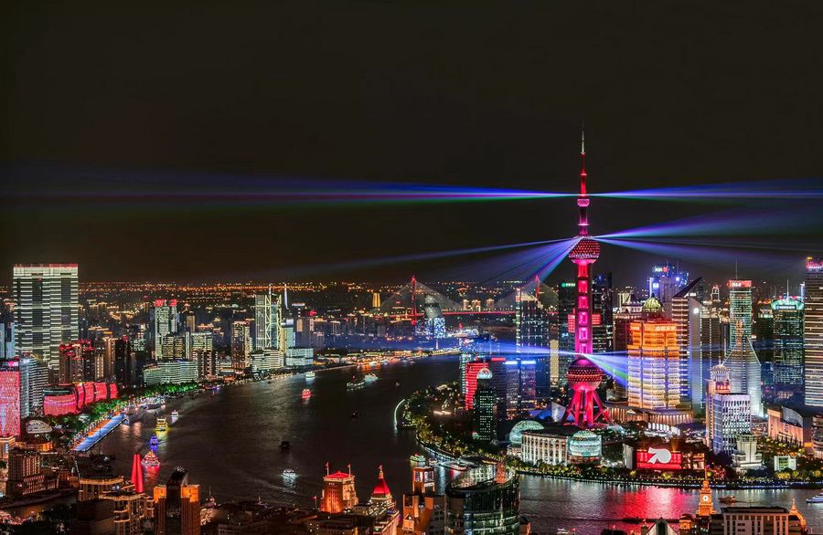 A light show is seen along the Huangpu River in Shanghai, east China, Sept. 18, 2019. The second China International Import Expo (CIIE) is scheduled to run from Nov. 5 to Nov. 10 in Shanghai. (Xinhua/Ren Long)