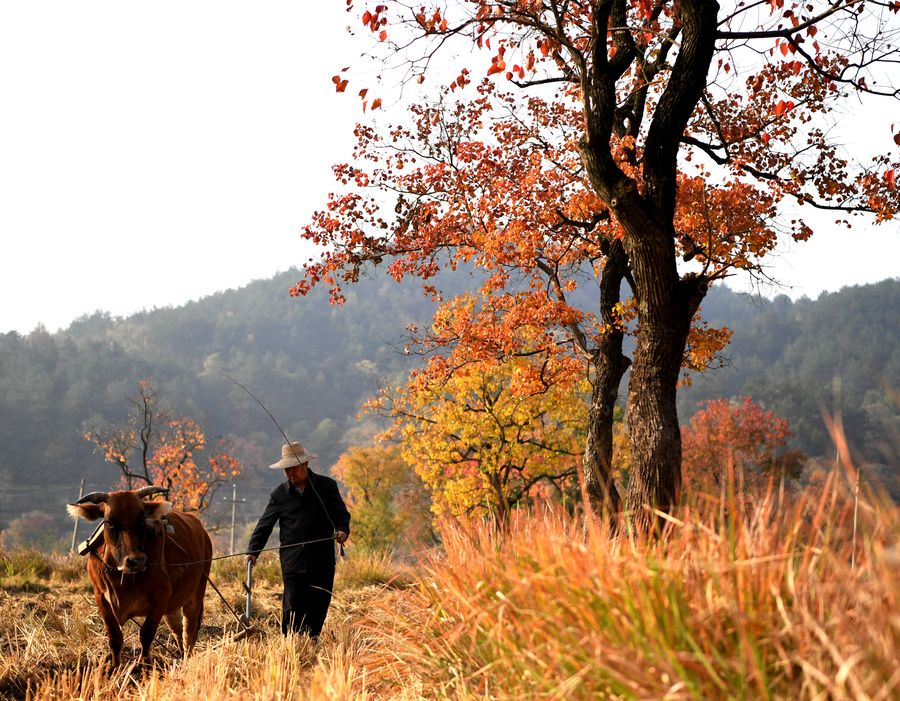 A farmer ploughs in the field with a head of cattle at the foot of Dabieshan Mountain in Liluocheng Village of Xinyang City, central China's Henan Province, Nov. 3, 2019. (Photo by Hao Yuan/Xinhua)