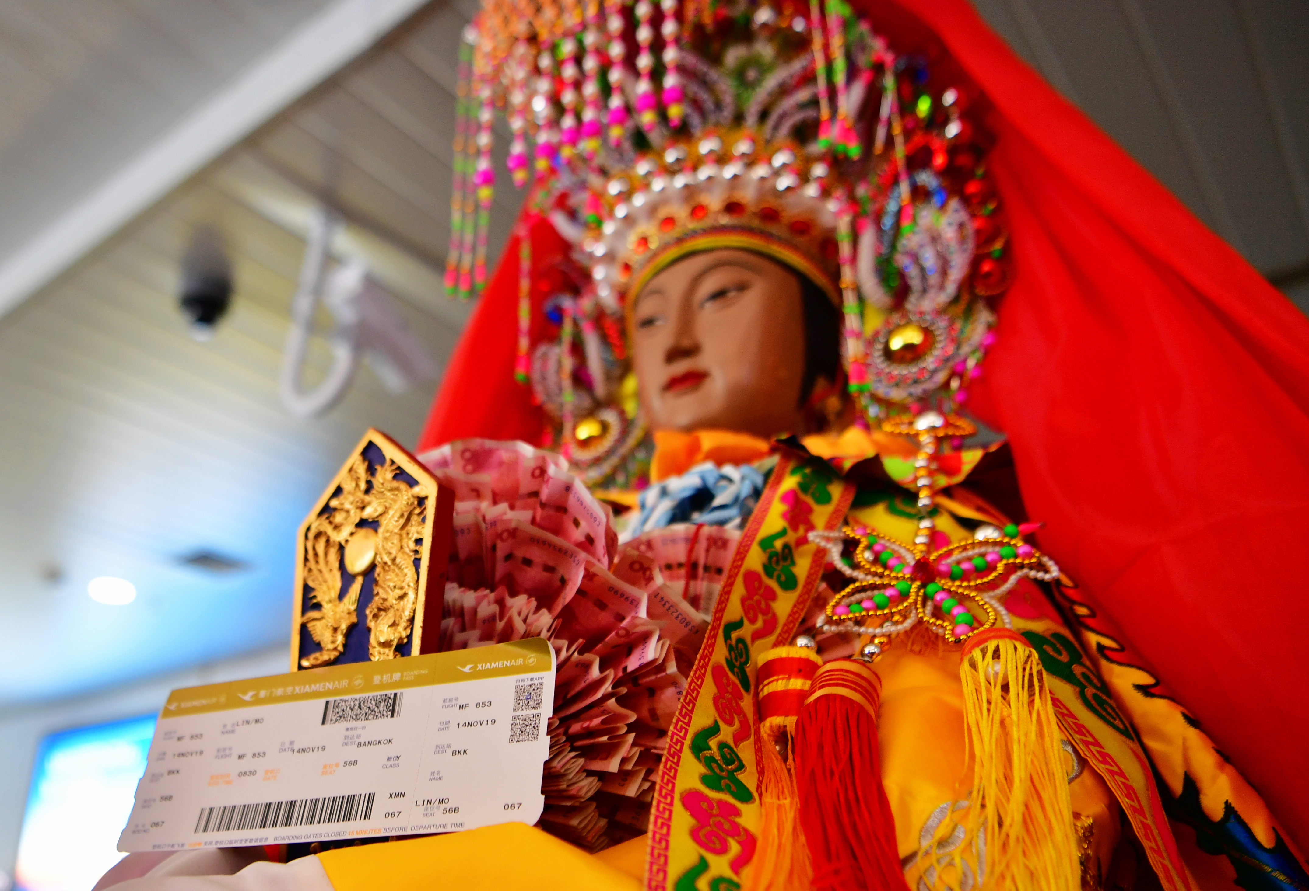 Photo taken on Nov. 14, 2019 shows the statue of the Chinese sea goddess Mazu and the boarding pass of an airplane which will take her to Thailand from Xiamen, southeast China's Fujian Province. (Xinhua/Wei Peiquan)