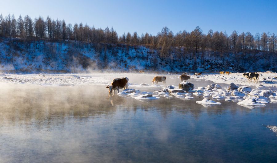 A herd of cattle drink water in an unfrozen section of the Halha River in the city of Arxan of Hinggan League, Nov. 20, 2019. (Xinhua/Peng Yuan)