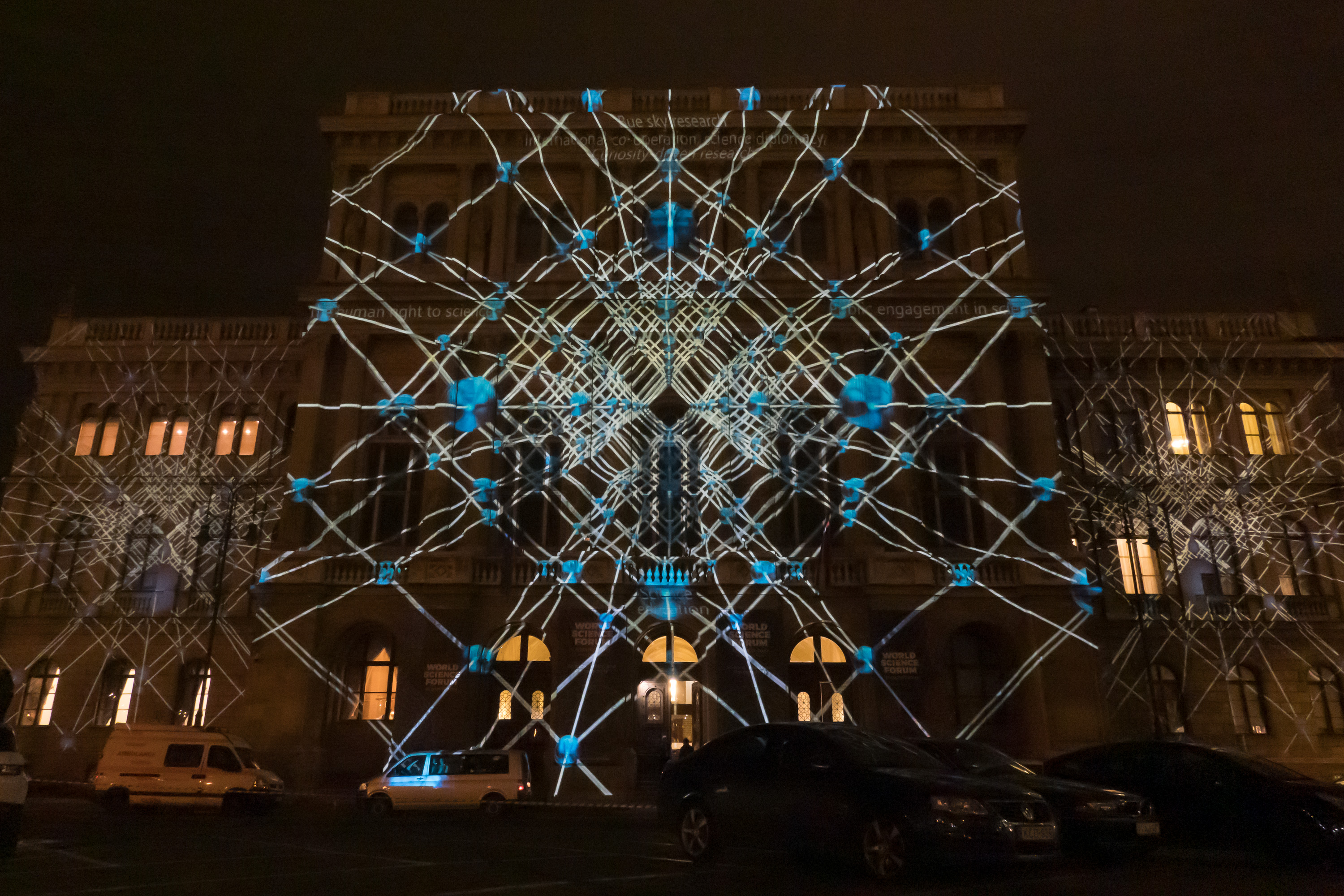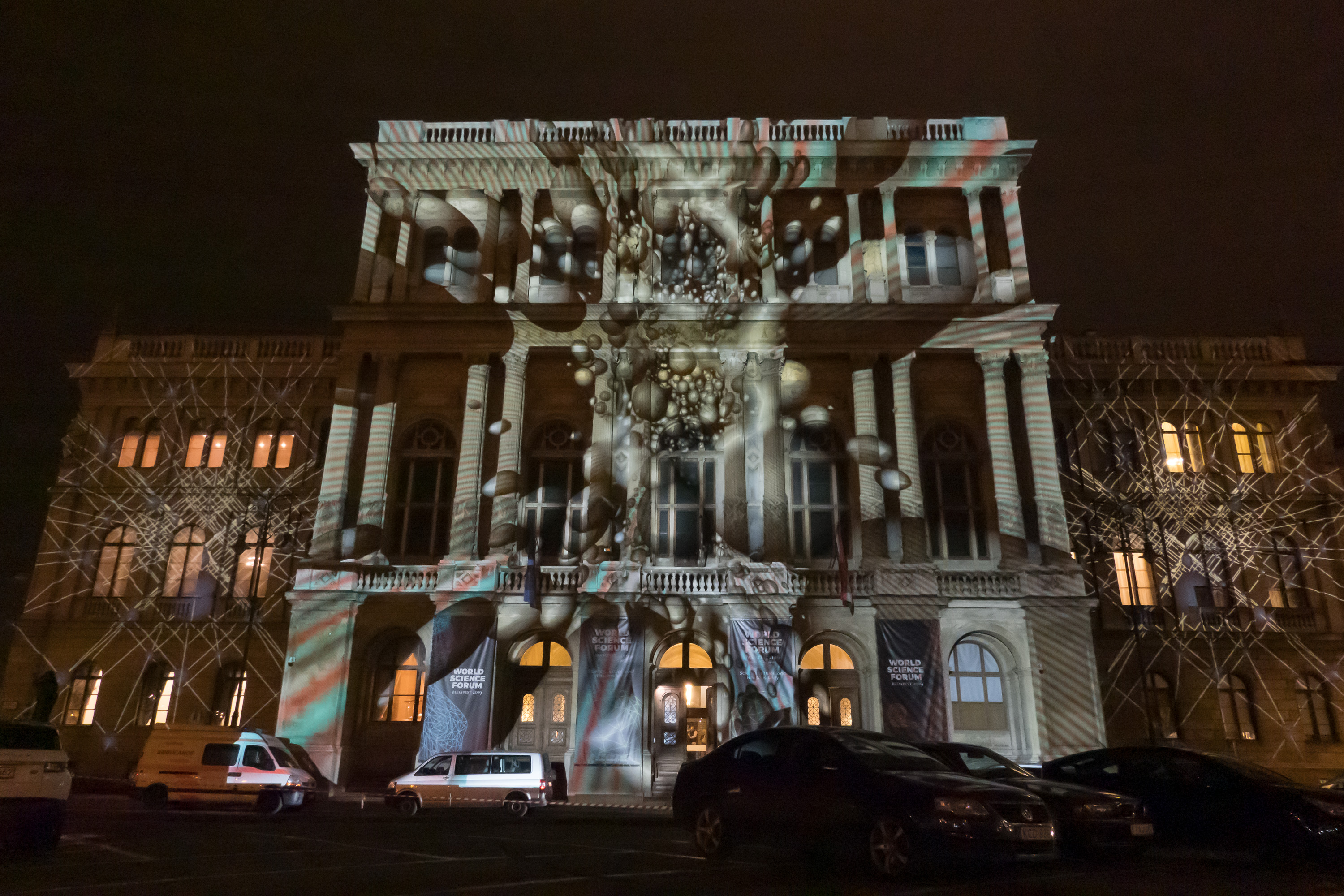Light projection is shown on the facade of the Hungarian Science Academy as a side event of the World Science Forum in Budapest, Hungary. (Photo by Attila Volgyi/Xinhua)