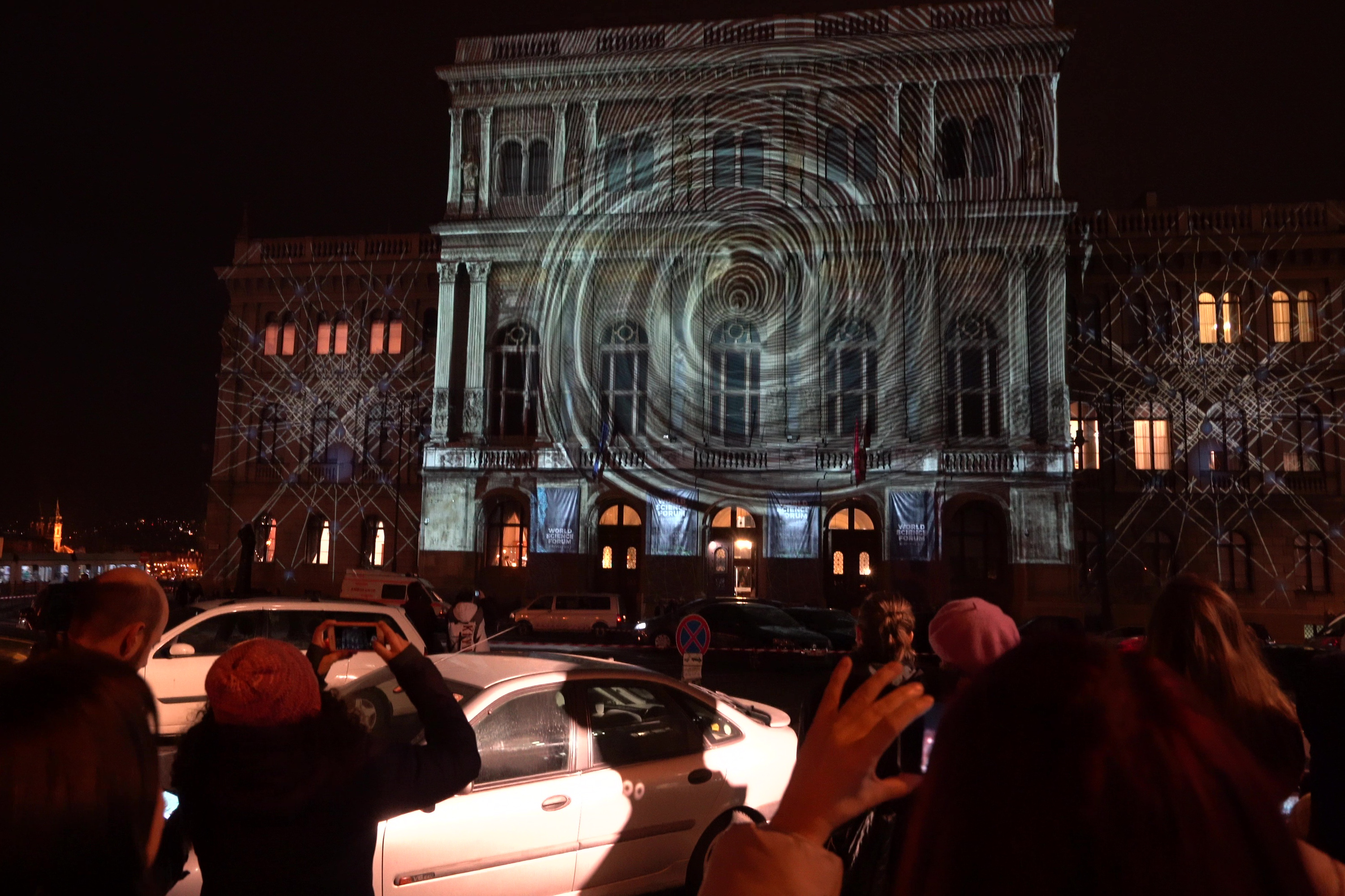 Viewers watch a light projection shown on the facade of the Hungarian Science Academy as a side event of the World Science Forum in Budapest, Hungary. (Photo by Attila Volgyi/Xinhua)
