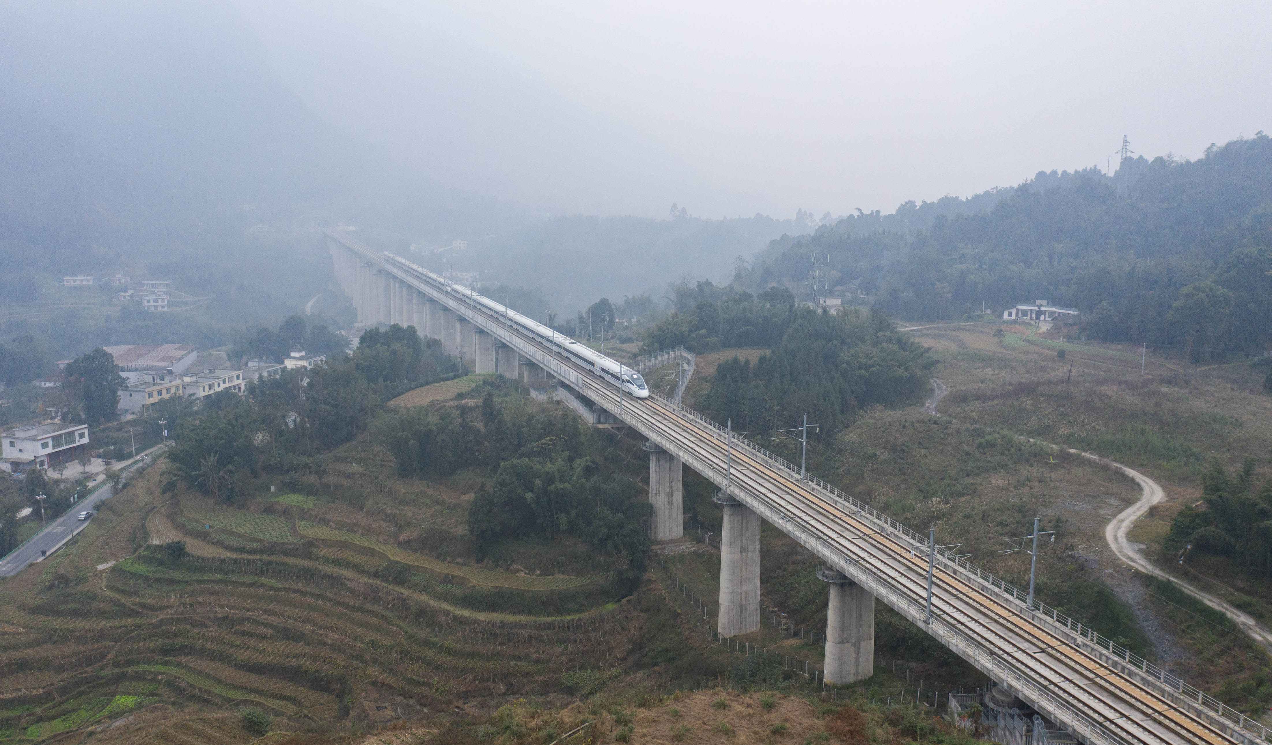Aerial photo taken on Dec. 16, 2019 shows a bullet train running on the Chengdu-Guiyang railway in southwest China's Sichuan Province. (Xinhua/Jiang Hongjing)