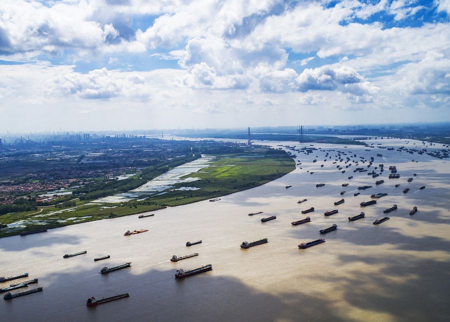 Aerial photo taken on Aug. 13, 2018 shows ships sailing on the Yangtze River near Yangluo Port in Wuhan, capital of central China's Hubei Province. (Xinhua/Xiao Yijiu)