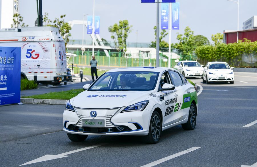 A Level 4 (L4) self-driving Changan Automobile takes a driving drill in a pilot zone for 5G-based autonomous driving in southwest China's Chongqing Municipality, July 26, 2019. (Xinhua/Liu Chan)