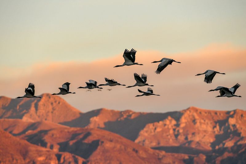 Black-necked cranes fly over a natural reserve for the birds in Lhunzhub County, southwest China's Tibet Autonomous Region, Jan. 1, 2019. (Xinhua/Zhang Rufeng)