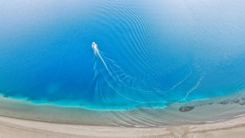 Aerial photo taken on July 22, 2019 shows a Chinese scientific expedition team taking a boat to the main area of Lake Yamzbog Yumco for survey in Shannan, southwest China's Tibet Autonomous Region. (Xinhua/Jigme Dorje)