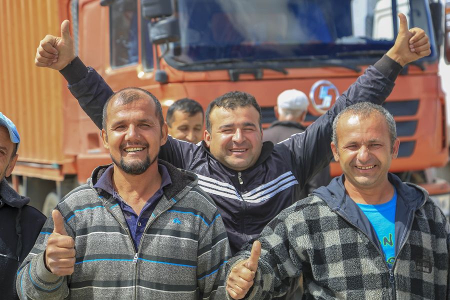 Passengers from Tajikistan pose for a group photo in Karasu port, northwest China's Xinjiang Uygur Autonomous Region, June 11, 2019. With the Belt and Road Initiative, the trade between Xinjiang, Kyrgyzstan and Tajikistan has continued to develop. (Xinhua/Huang Huan)