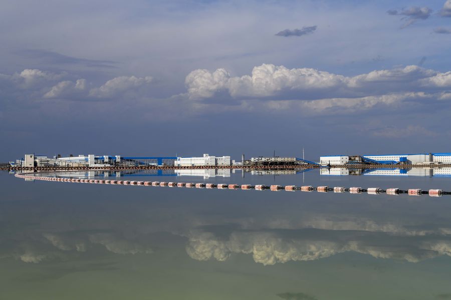 The production equipment at Lop Nur in Ruoqiang county, northwest China's Xinjiang Uygur Autonomous Region, July 18, 2019. Lop Nur, the second largest saltwater lake in China, is an important production base of potassium sulfate. (Xinhua/Zhao Ge)