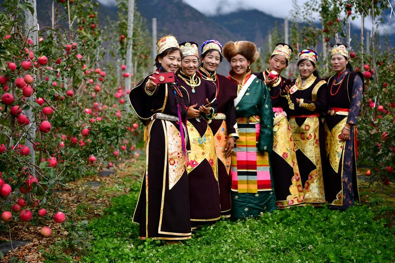 Villagers pose for a group photo at a standardized apple cultivation demonstration park in Lingpa Village of Chanag Township in Mainling County of Nyingchi, southwest China's Tibet Autonomous Region, Oct. 26, 2019. (Xinhua/Li Xin)