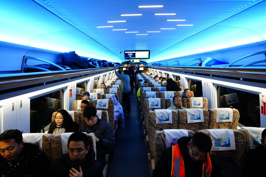 Passengers take the G8811 high-speed train bound for Taizicheng Railway Station running on the newly opened Beijing-Zhangjiakou high-speed railway, Dec. 30, 2019. (Xinhua/Xing Guangli)