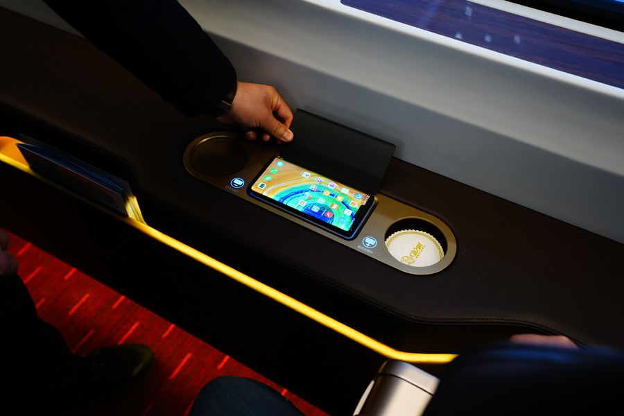 A passenger experiences the wireless charger for smartphones on the G8811 high-speed train bound for Taizicheng Railway Station running on the newly-opened Beijing-Zhangjiakou high-speed railway, Dec. 30, 2019. (Xinhua/Xing Guangli)