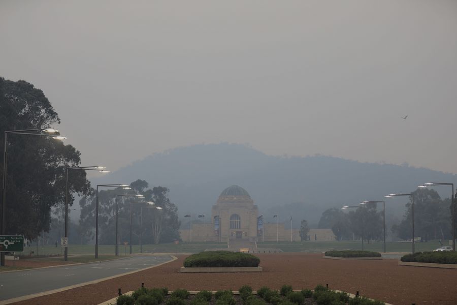 Photo taken on Dec. 17, 2019 shows the smoke-shrouded Australian War Memorial in Canberra, Australia. (Photo by Chu Chen/Xinhua)