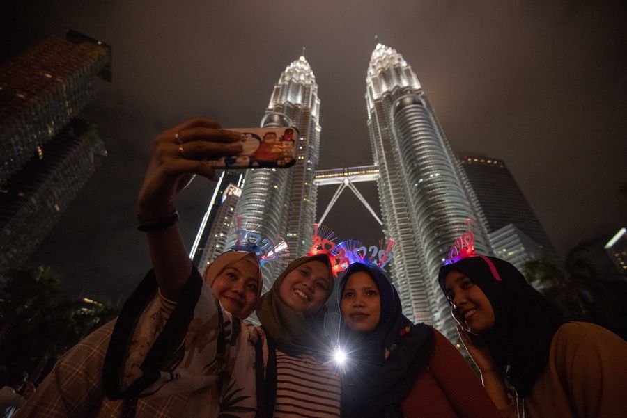Photo taken on Dec. 31, 2019, shows people celebrate the New Year near the Petronas Twin Towers in Kuala Lumpur, Malaysia. (Xinhua/Chong Voon Chung)