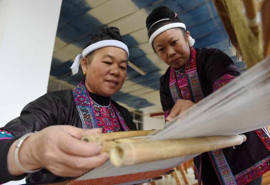 Dong ethnic women communicate on tapestry skills at a relocated residential area in Guyi Township in Sanjiang Dong Autonomous County of Liuzhou, south China's Guangxi Zhuang Autonomous Region, Nov. 27, 2019. The unique traditional embroidery and tapestry of Dong ethnic group has a long history. In recent years, local authorities have been expanding market for this intangible cultural heritage so that Dong ethnic women will have more job opportunities to shake off poverty and preserve the cultural heritage. (Xinhua/Gong Pukang)