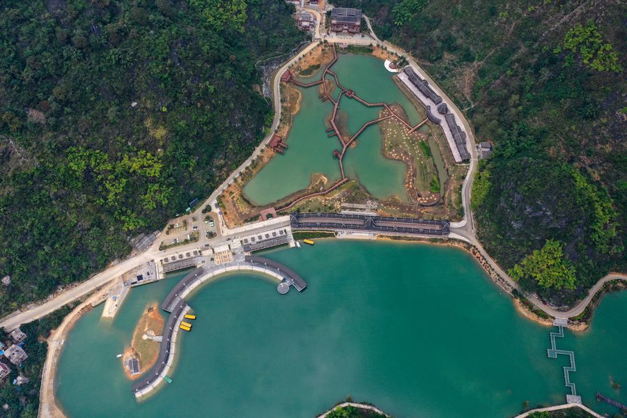 The scenery at the Haokun Lake scenic area in Lingyun County of Baise City, south China's Guangxi Zhuang Autonomous Region, Nov. 24, 2019. Taking advantage of the natural beauty around Haokun Lake, authorities in Lingyun have been striving to develop ecological tourism in a bid to shake off poverty and boost the income of local residents. At present, ecological tourism has become a pillar industry to help people here bid farewell to poverty. (Xinhua/Zhang Ailin)