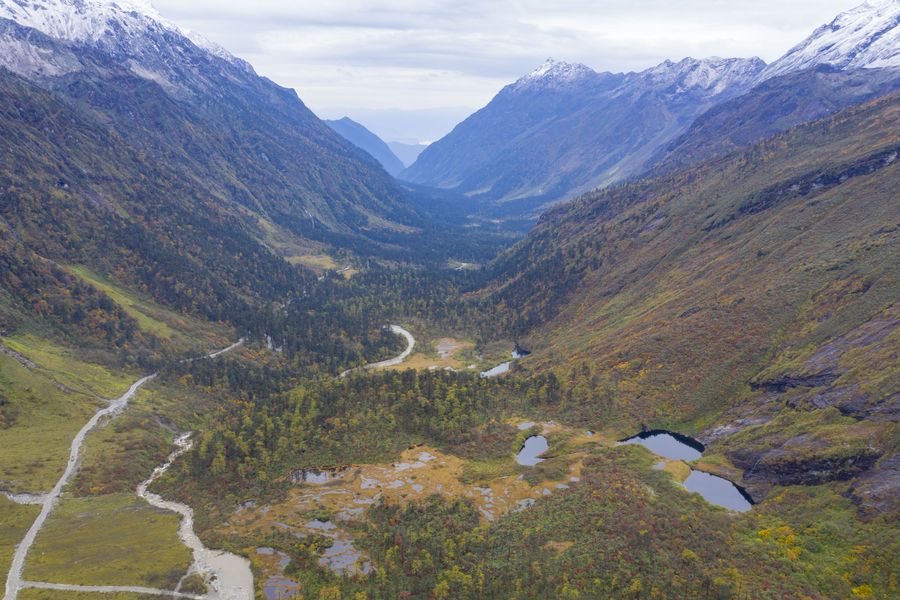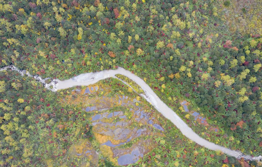 The autumn scenery along a rural road, which is being built, linking counties of Mainling and Medog in southwest China's Tibet Autonomous Region, Oct. 24, 2019. (Xinhua/Purbu Zhaxi)