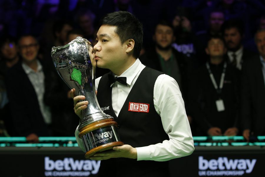 Ding Junhui of China kisses his trophy after winning the Snooker UK Championship 2019 final match against Stephen Maguire of Scotland in York, Britain, on Dec. 8, 2019. (Photo by Ed Sykes/Xinhua)