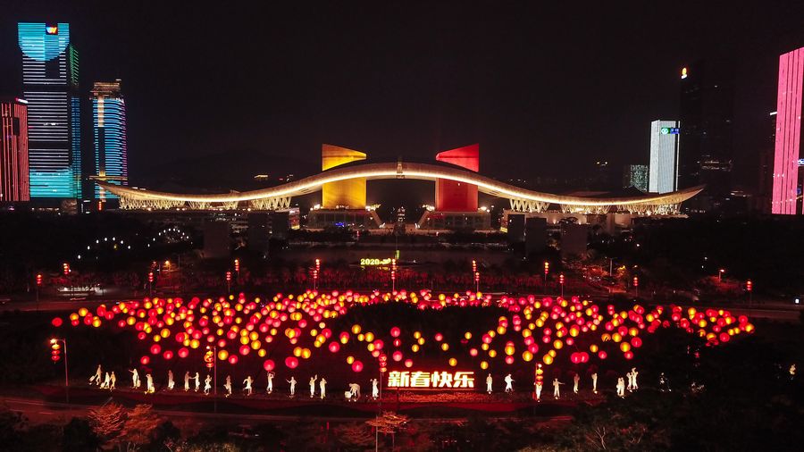 Aerial photo taken on Jan. 19, 2020 shows lanterns being illuminated to greet the coming Spring Festival in Shenzhen, south China's Guangdong province. (Xinhua/Mao Siqian)