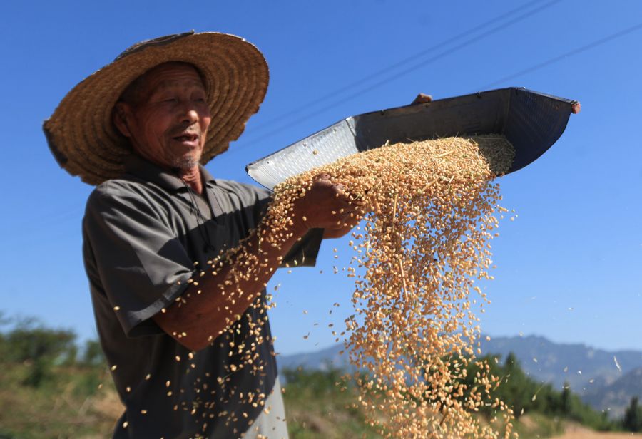 A villager dries the newly harvested wheat at Mengsheng Village in Pingyi County, east China's Shandong Province, May 29, 2019. (Xinhua/Wu Jiquan)