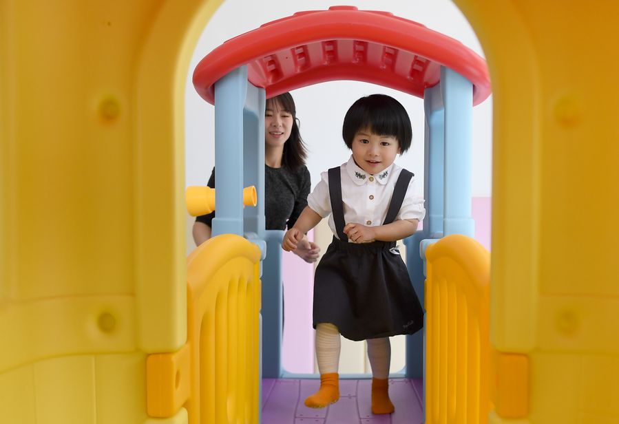Infants have fun with their parents in Chengbei baby center of Chengguan Township, Ningshan County, northwest China's Shaanxi Province on May 11, 2019. An experimental project, which offers free early education to infants below three years old and free training in parenting is underway here. It aims to help children living in impoverished areas to better grow up. (Xinhua/Liu Xiao)