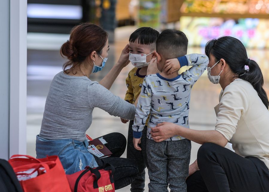 A woman helps a child wear a mask at the Haikou Meilan International Airport in Haikou, south China's Hainan Province, Jan. 25, 2020. (Photo by Pu Xiaoxu/Xinhua)